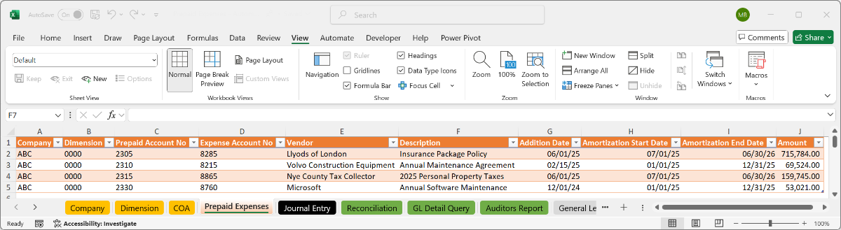 Enter prepaid expenses as they occur β one line per item. Assign the company, dimensions, prepaid account, amortization account, amount, and dates. Once entered, prepaid records carry forward automatically into future periods. No re-entry, no manual schedule maintenance.